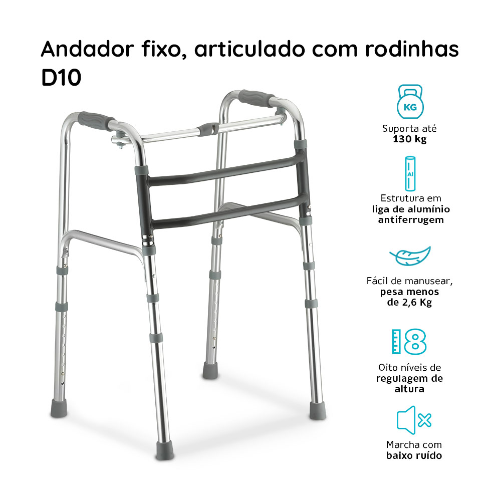 O Andador D10 Dellamed de alumínio é 3 em 1 (Fixo, articulado e móvel) dispondo de 3 barras. Indicado para auxiliar pessoas com dificuldade de locomoção ou equilíbrio. Além disso ele é dobrável para facilitar o transporte e levar até mesmo em viagens.